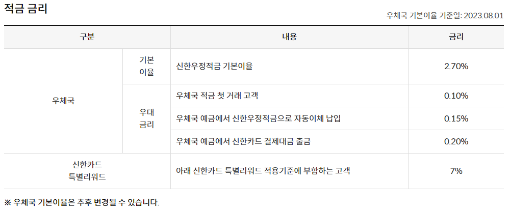 우체국 신한 우정적금은 우체국 금리와 함께 신한카. 드의 특별보상혜택이 제공됩니다. 기본금리는 연 2.7%이며, 자동이체 등 우대조건을 충족하면 최대 연 0.45% p가 추가제공됩니다.