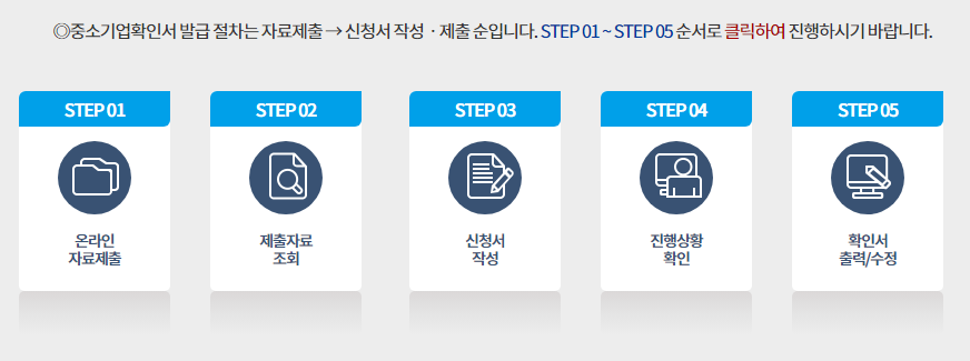4. 신청서작성 신청 후 진행상확 확인은 중소기업확인서발급신청메뉴 진행상황확인에서 확인할 수 있습니다.