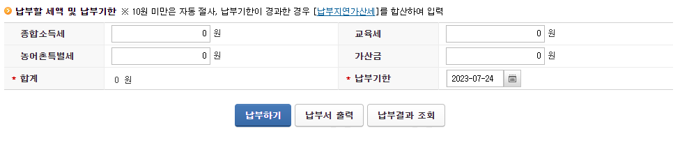 납부할 세액 및 납부기관에 소득세에 금액 입력